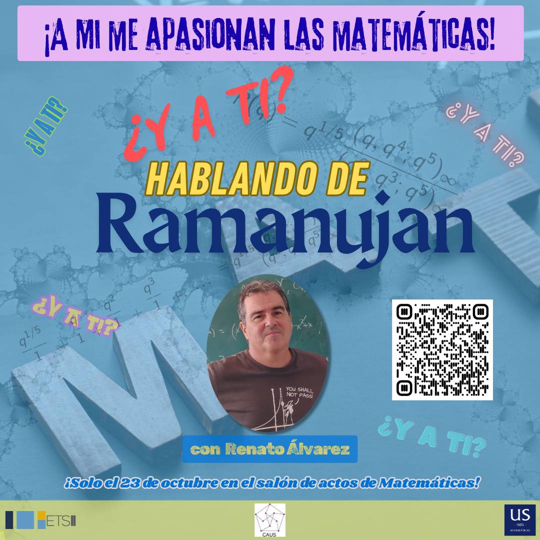 ► 16-10-2025: El próximo jueves 26 de octubre en el salón de actos de la Facultad de Matemáticas de la Universidad de Sevilla tendrá lugar la primera charla del ciclo "A mi me apasionan las Matemáticas ¿y a ti?" organizado por el Club Algoritmia de la Universidad de Sevilla en colaboración con la Facultad de Matemáticas y la Escuela Técnica Superior de Ingeniería Informática. En dicha charla de carácter muy informal hablaré de Ramanujan y algunos de sus resultados menos conocidos.