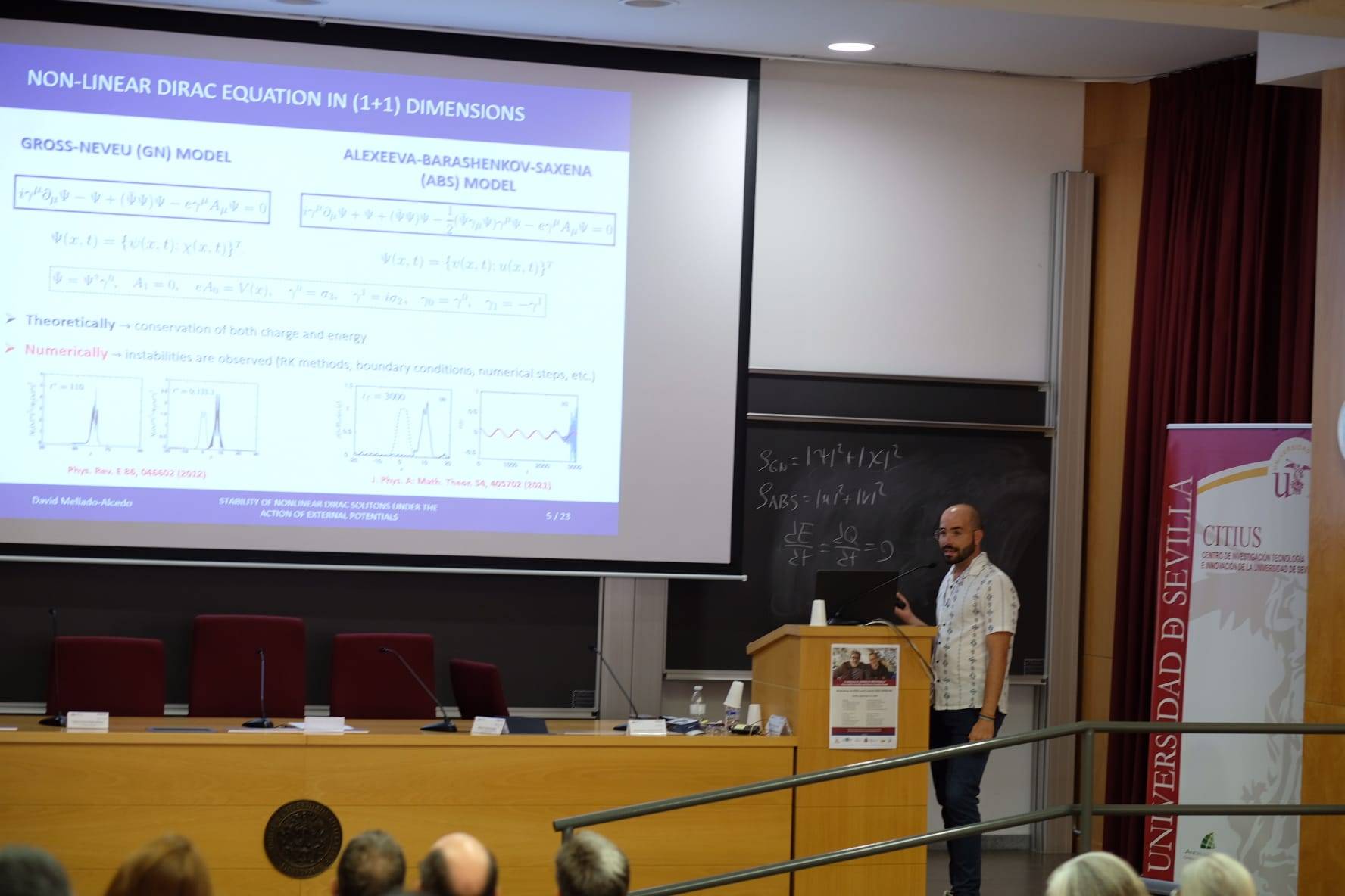 David Mellado impartiendo la charla Stability of nonlinear Dirac solitons under the action of external potentials el 3 de septiembre de 2025 en el Workshop on PDEs and Control 2025 (PKM-60). (descarga las transparencias pinchando AQUÍ.